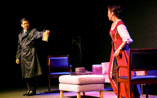 接着上场的是话剧《阴差阳错 》的片段,该剧2015年由东方搬上芝加哥舞台。故事讲述的是两位被害者的灵魂发生了互换,性别和身份发生倒错,迫使二人将错就错地体验了彼此的生活经历和喜怒哀乐。二人最后在荒诞的经历中萌生了真情。赵湘和刘汉平二位演员配合默契,在不断的性别转换中,通过声音、动作和内心的变化出色地演绎了男女两重身份。他们的表演很投入,最后一幕灵魂复原时,二人恋恋不舍的场景,令人动容。