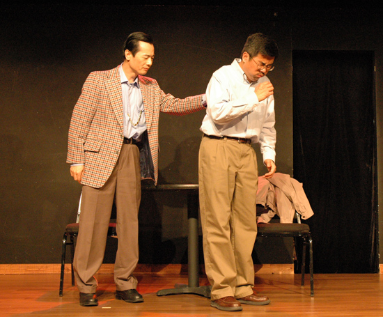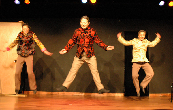 實力派演技的趙延彤,是芝加哥大大小小戲劇的要角,他擔綱演出的獨角戲,藉著精彩的獨白與豐富的肢體語言,緊緊吸引大家的目光。改編自法國十九世紀喜劇家腊比西(Eugene Labiche)名著「迷眼的沙子」的「鍍金」,是當天演出的壓軸。劇中,由陳美升所飾演的馬太太,一心想把女兒嫁入好人家,她鼓起如簧之舌,將一年接不到一個病人的馬先生(張力飾演),吹噓成病患擠破門的名醫,其實沒什麼才藝的寶貝女兒,被媽媽形容為琴棋書畫樣樣精通的天才美女,而小康之家也成了傭僕滿滿的大戶人家。馬太太言行,儘管剛開始備受馬先生批評謾罵,然而他眼見太太的誇大,卻輕易獲得豪門家庭夫婦的青睞,也開始訓練自己散出大把迷濛旁人眼睛的沙子。