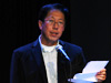 刘汉平继去年以京剧韵白方式展示《再别康桥》后,今天再展特殊才艺。他身着蓝色中装,手持折扇,来了一段岳飞精中报国的评书。