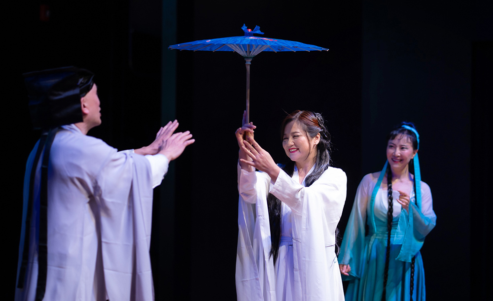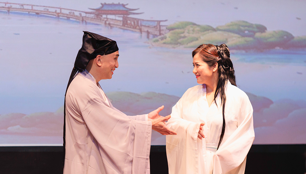 接下来上演的是关于白蛇和许仙的爱情故事的短剧《千年就一回》。千年之前,白蛇被一位小牧童所救,千年之后白蛇修炼成人,决定以爱偿还救命之恩。然而,爱则爱矣,却是爱在心头口难开,黄海燕(饰演白蛇)将白蛇对许仙的欲说还休千回百转的爱情表现得极其细腻,或娇羞或犹疑或甜蜜,无不呈现得淋漓尽致,而由孙晓明饰演的青蛇则活泼可爱,生动俏皮,刘承熹饰演的许仙憨态可菊又诙谐。三位演员为观众呈现了一个别样的白蛇的故事,为观众带来了新奇的观剧体验。
