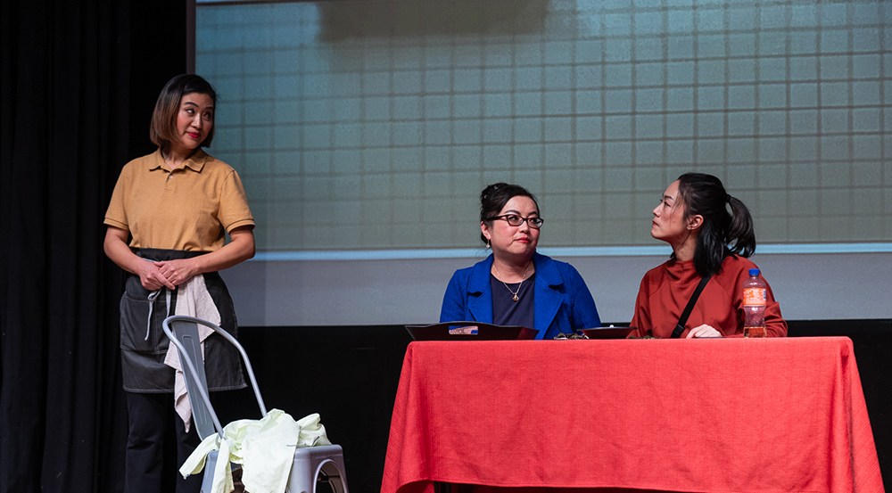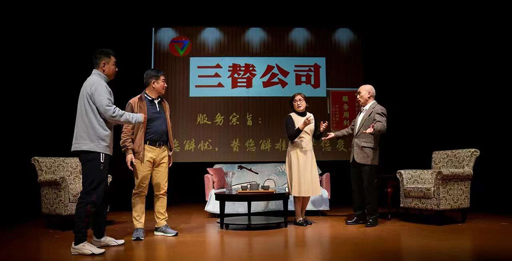 演出的最后一个剧目是荒诞短剧《三替公司》。三位不甘过平庸人生的球友一起成立了一家《三替公司》,公司因为接了替人约会和替人颁奖的活,而引发了一连串的笑话。五位演员(其中李莉扮演在出版社工作的李小姐,李力扬、刘承熹和牛明恺扮演三位公司创始人,李敏扮演作家)配合默契,精准地把握了喜剧的节奏,他们本着"一本正经地搞笑"的原则,将作品的荒诞气质进行了极致的表达。《三替公司》将演出推向高潮。在演员们不断抖落的包袱中,观众的笑声此起彼伏,整个剧场变成了欢乐的海洋。最后,演出在《三替公司》三位创始人极具喜感的舞蹈表演中,在观众热烈的掌声和欢呼声中,圆满落下帷幕。