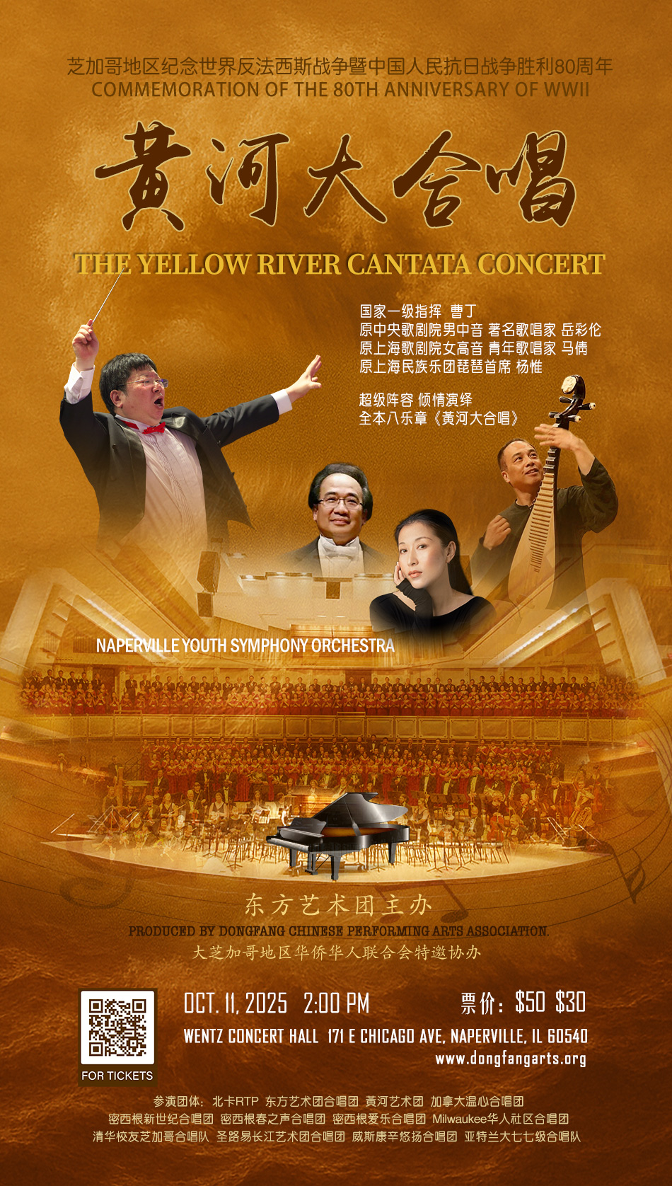 2025年10月11日下午2:00,一场充满纪念意义与艺术高度的音乐盛典——V80《黄河大合唱》纪念音乐会将于芝加哥Naperville的Wentz音乐厅震撼上演。届时,来自美加地区的三百余位艺术家和演员将齐聚一堂,共同纪念世界反法西斯战争胜利暨中国人民抗日战争胜利80周年。