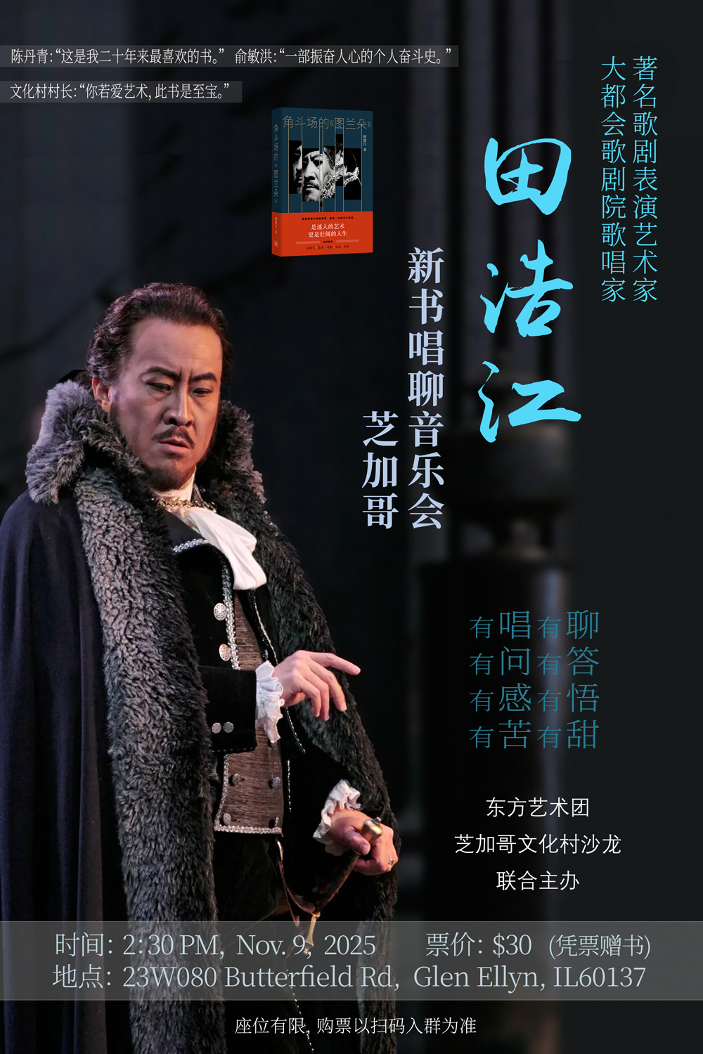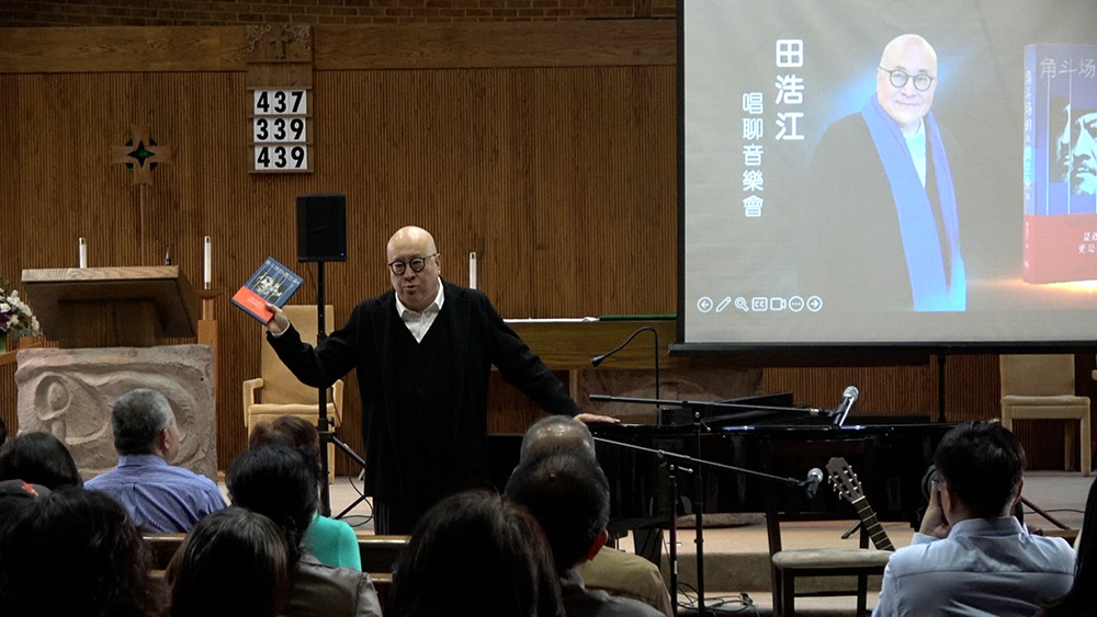 十一月九日下午,在芝加哥西郊Glen Ellyn 的一个教堂里,芝加哥"东方艺术团"及"文化村沙龙"联合举办了"田浩江新书唱聊音乐会"。整个会场座无虚席,除了来自芝加哥地区的艺术爱好者们,还有一些是从印第安纳州及密歇根州远道赶来。