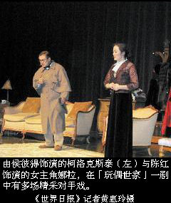 6日在芝城西郊恩赫思特(Elmhurst) 提摩西天主教会初中(Timothy Christian Middle School)演出的「玩偶世家」,由张力、赵延彤担任制作人,靳东生担任导演,艺术指导及舞台总监为谷文瑞,全剧六位演员则由舞台表演经验丰富的陈红扮演女主角娜拉,刘承熹饰演全剧另一位关键人物海尔茂(挪拉丈夫),其它演员还包括须文敏饰演娜拉好友林丹太太,侯彼得饰演柯洛克斯泰,李述阳扮演保母,以及陈庆琳演出仆人。