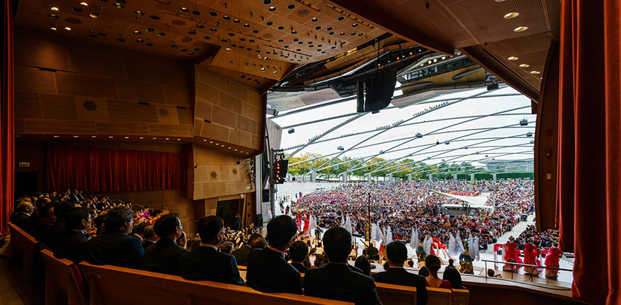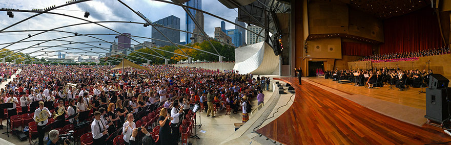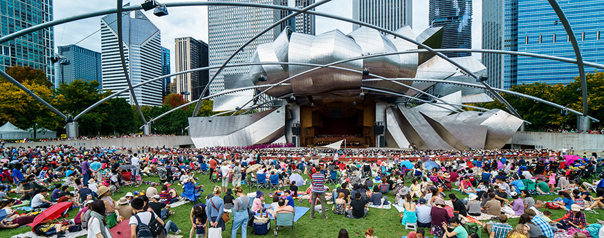 由获得普利策建筑奖和国家艺术设计勋章的世界著名设计大师Frank Gehry设计的Jay Pritzker Pavilion露天音乐厅观众区有 4000个固定座位和可容纳10000名观众的草坪区。千禧公园敞开式的天篷音响效果是目前世界上最为先进的室外音乐会技术,其音响系统和扩音设备均达到世界一流水平,音响系统可传送到观众席的每个角度。可以容纳上万人的观众区草坪区不需要票,欢迎大家自带食物,饮料及野餐椅等在草坪区来感受千禧公园的世界最为先进的室外音响其音响系统和扩音设备。